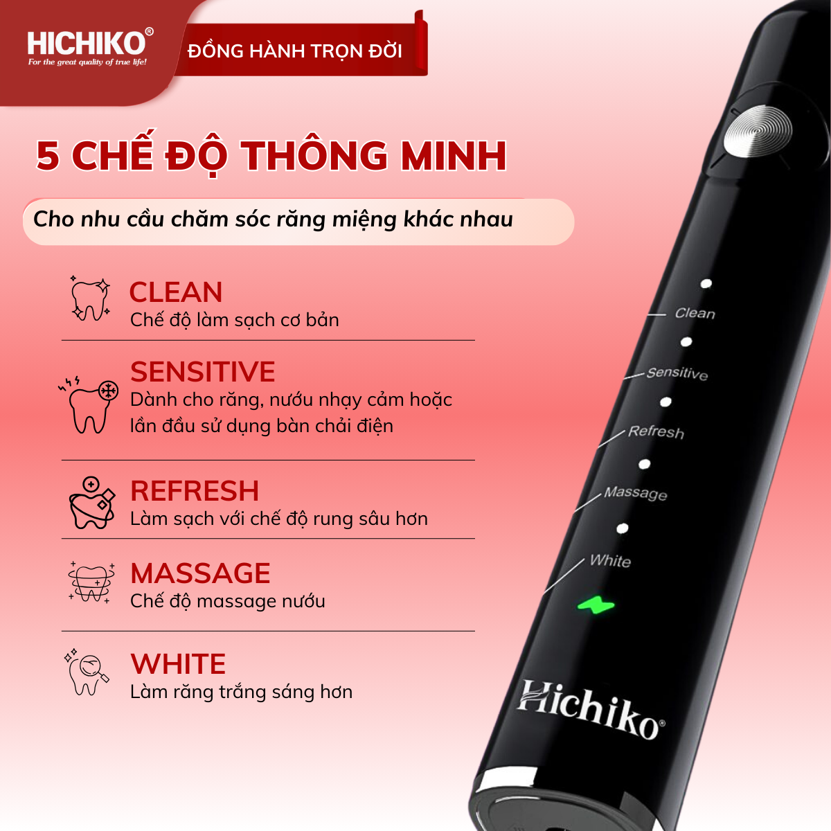 Bàn chải đánh răng điện Hichiko HC9801 5 chế độ, Công Nghệ Sóng Âm, Chải Sạch Mảng Bám Tới 10X