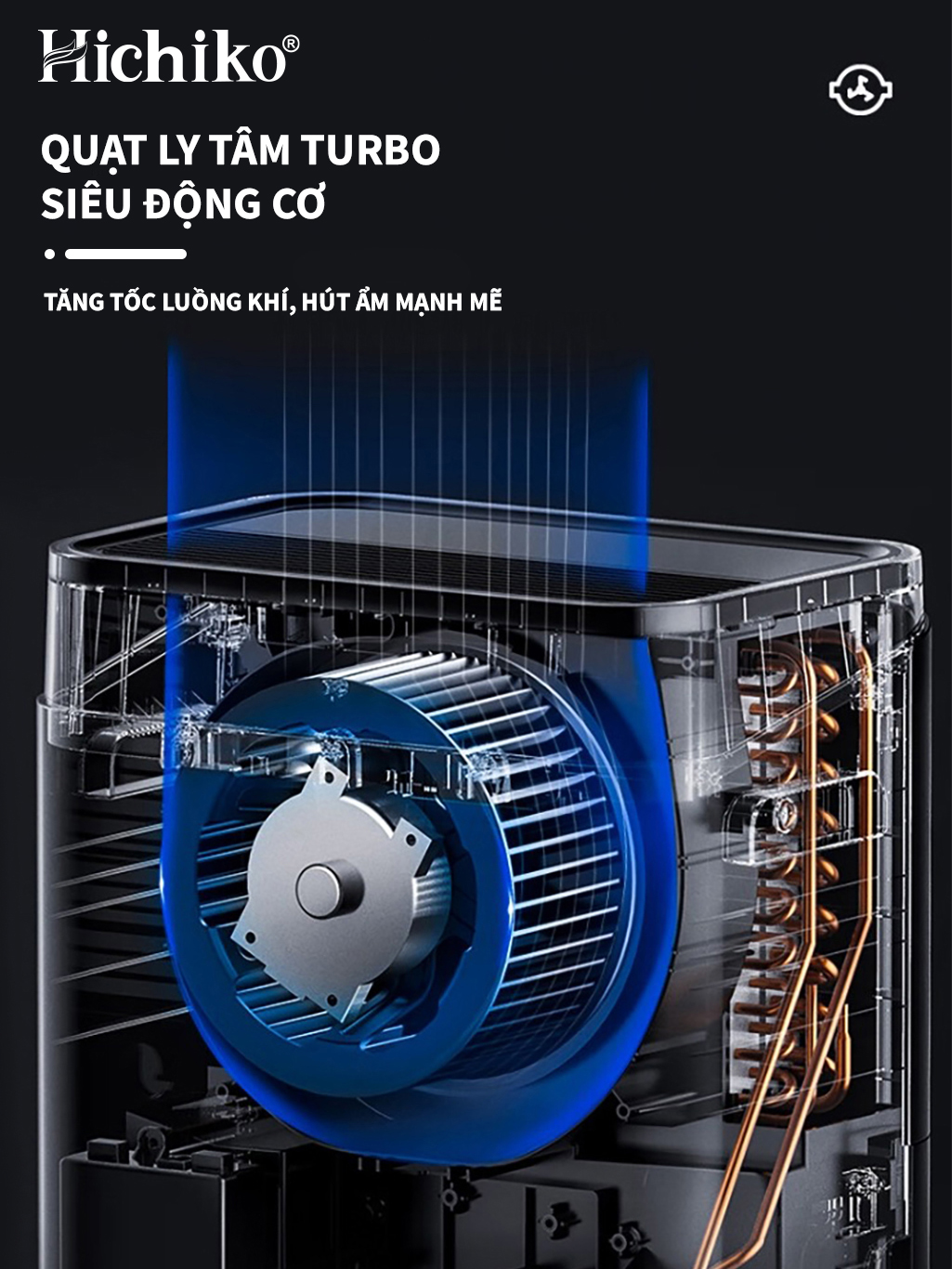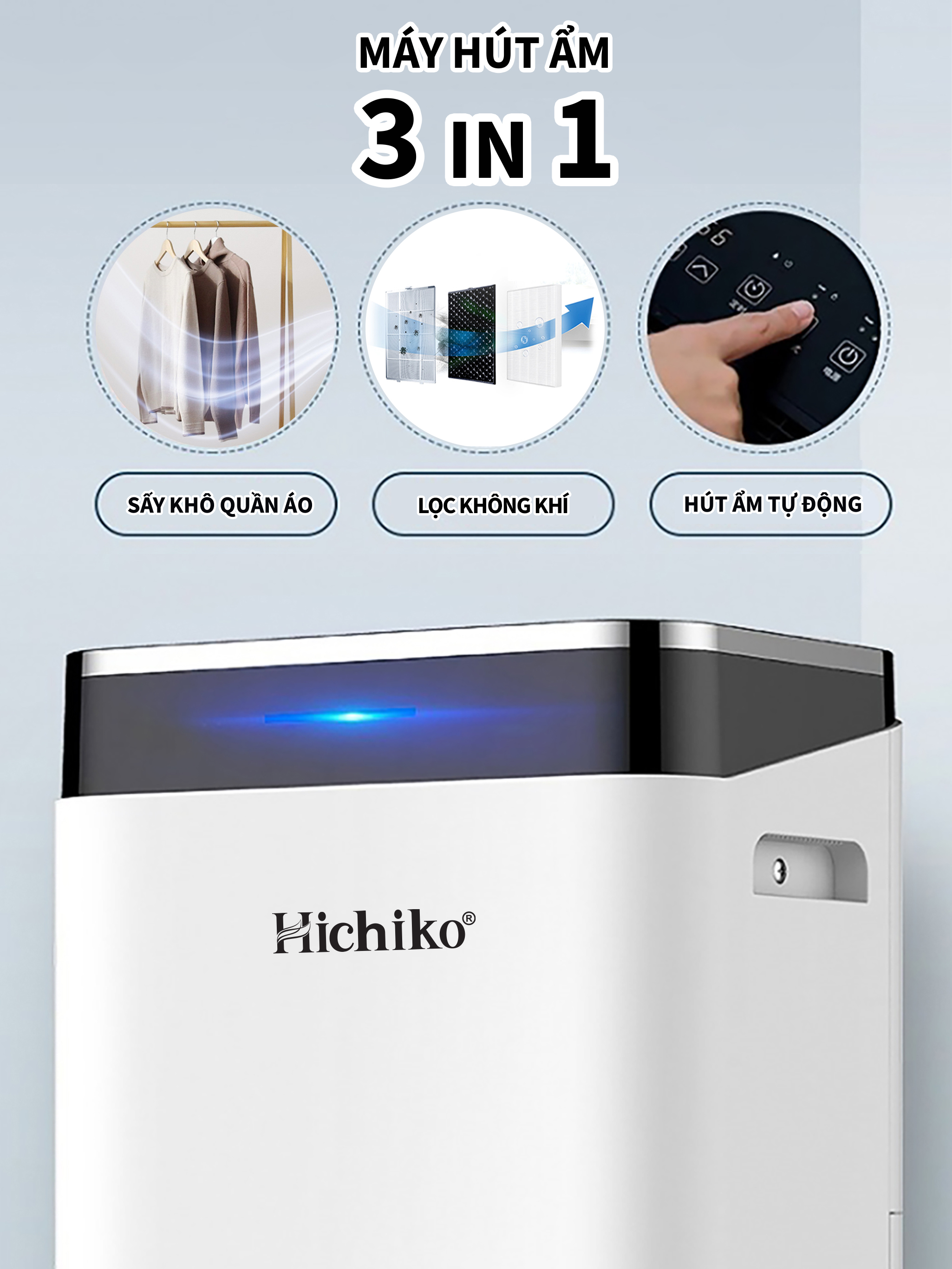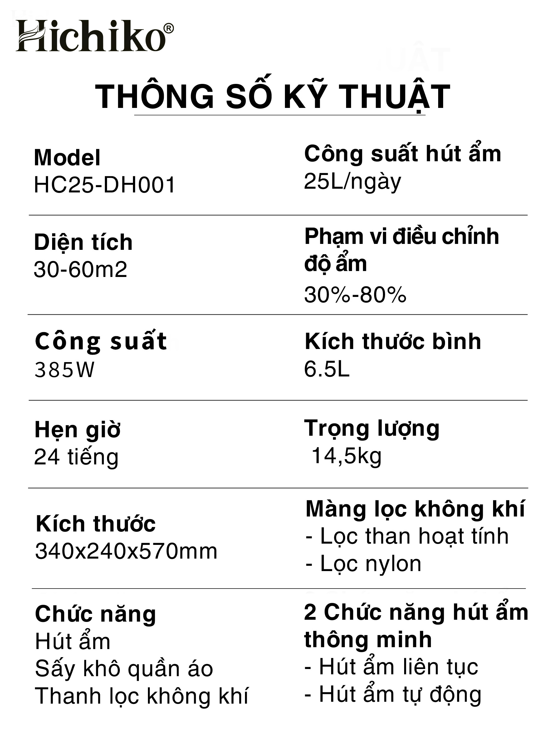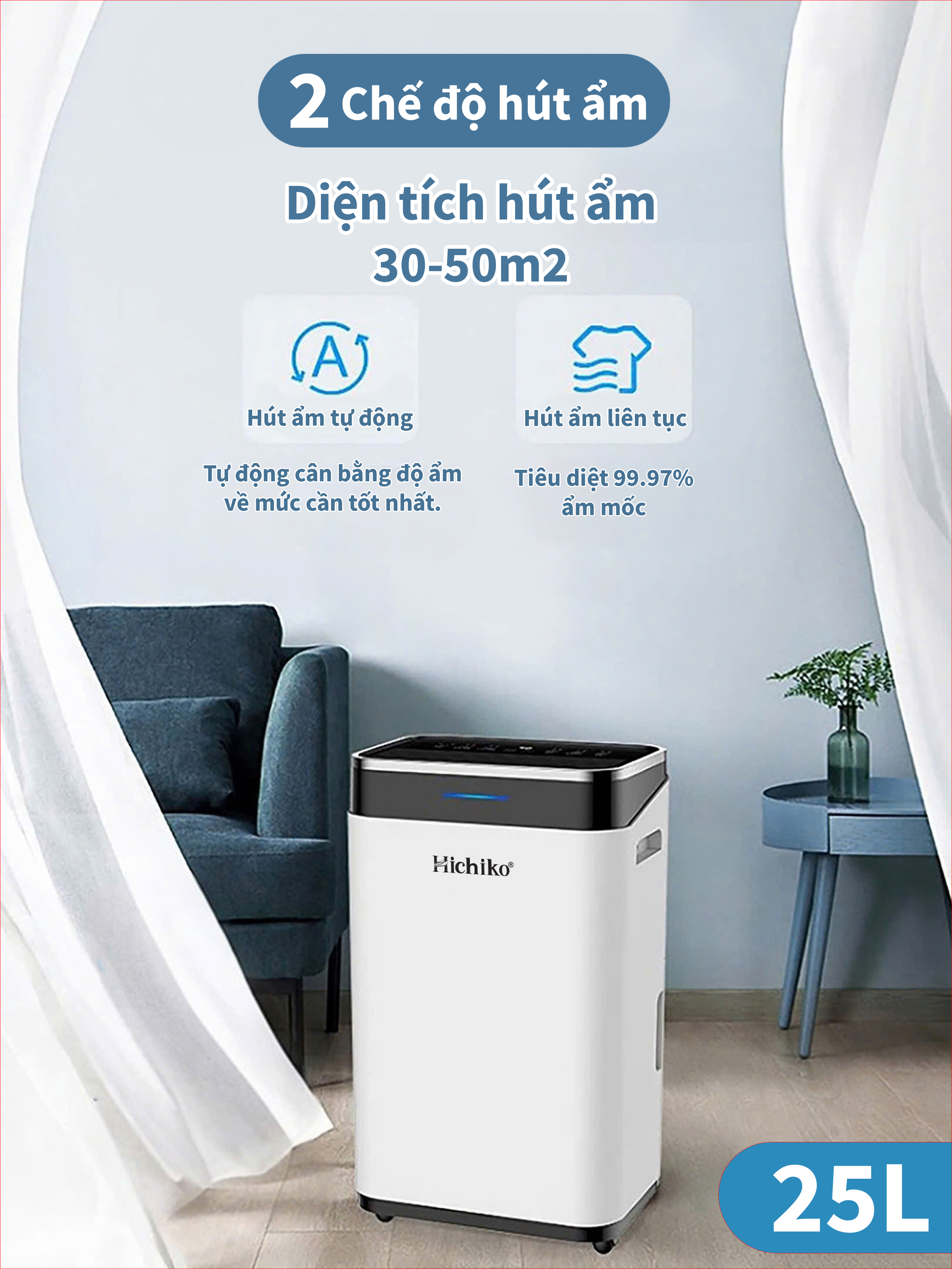 Máy hút ẩm Hichiko HC25-DH01, cho diện tích từ 30 - 60m2, công suất hút 25L/ngày, bình chứa 6.5L