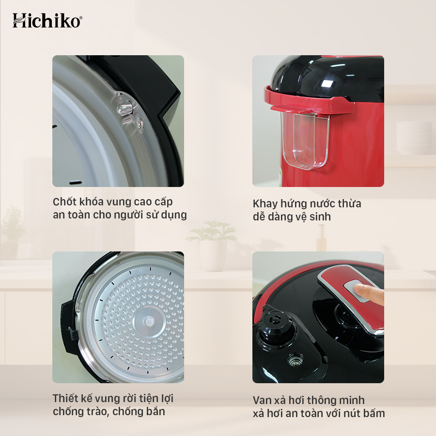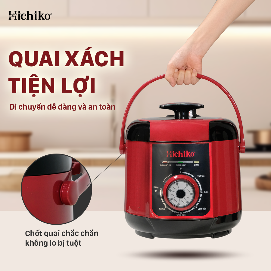NỒI ÁP SUẤT 6L HICHIKO HC-1864 có quai xách, có nút bấm xả hơi, chốt an toàn cao cấp