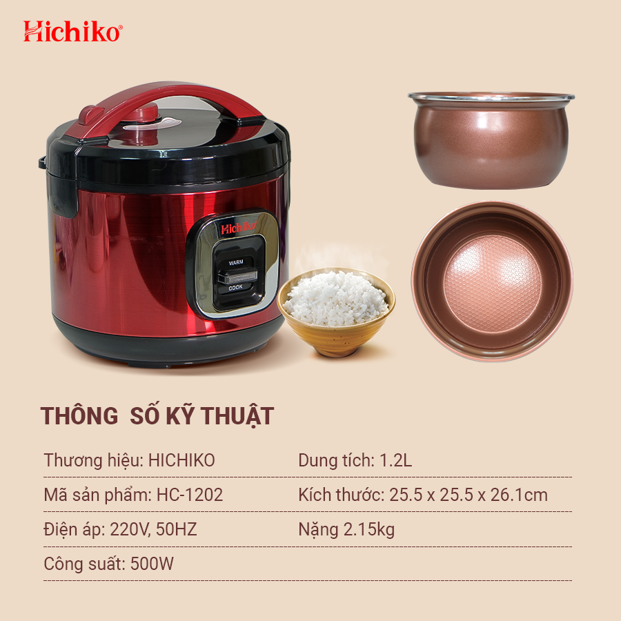 Nồi Nấu Cơm điện 1.2L Hichiko HC - 1202 dành cho gia đình từ 4 - 6 người, lòng niêu siêu chống dính (Màu Nâu)